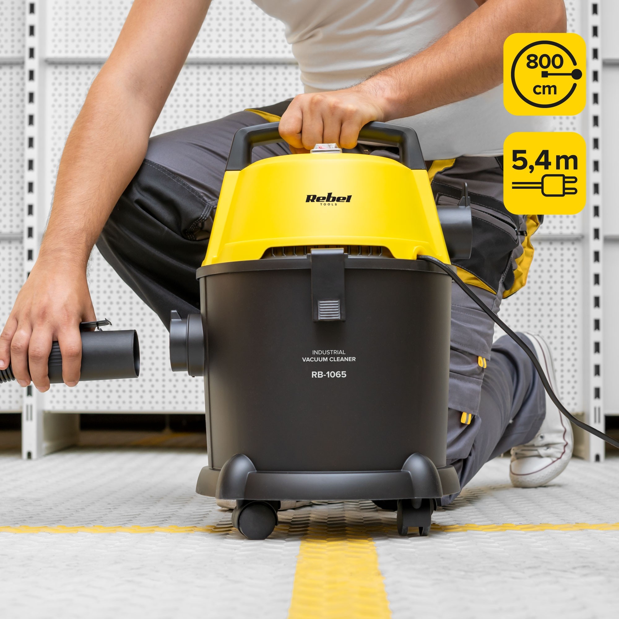 Rebel Wet&Dry został zaprojektowany z myślą o maksymalnym komforcie. Długi, 5,4-metrowy przewód i 8-metrowy zasięg pracy pozwalają swobodnie sprzątać większe powierzchnie bez konieczności częstego przepinania. Solidny uchwyt na górze ułatwia przenoszenie urządzenia, a praktyczny hak umożliwia szybkie zaczepienie i uporządkowanie przewodu po zakończonej pracy.