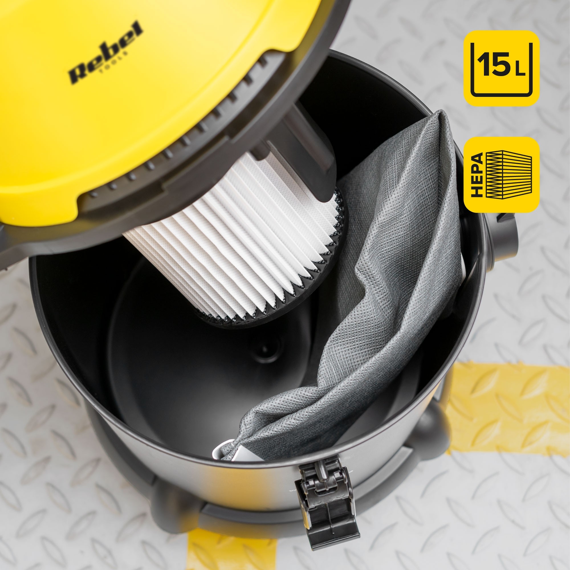 Przemysłowy odkurzacz Rebel posiada duży, 15-litrowy pojemnik na zanieczyszczenia, co pozwala na długą pracę, bez konieczności opróżniania. To na co, warto zwrócić uwagę to uniwersalny filtr HEPA, który nadaje się zarówno do zanieczyszczeń suchych jak też mokrych.